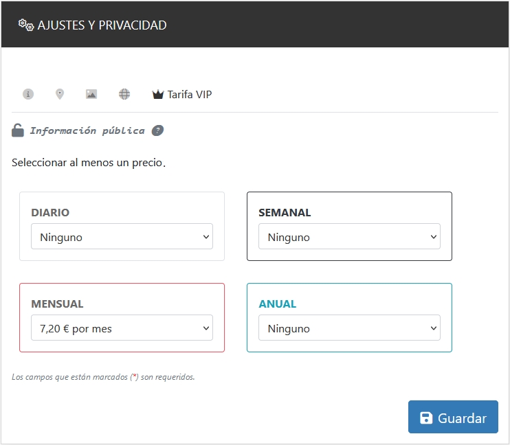 Es necesario configurar las tarifas de acceso al área para que los fans puedan suscribirse a tu tienda.