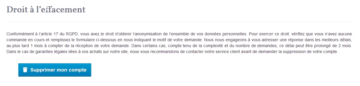 Vous pouvez à tout moment modifier vos données personnelles en vous connectant à votre espace client et en accédant à la rubrique "Droit à l'effacement"
