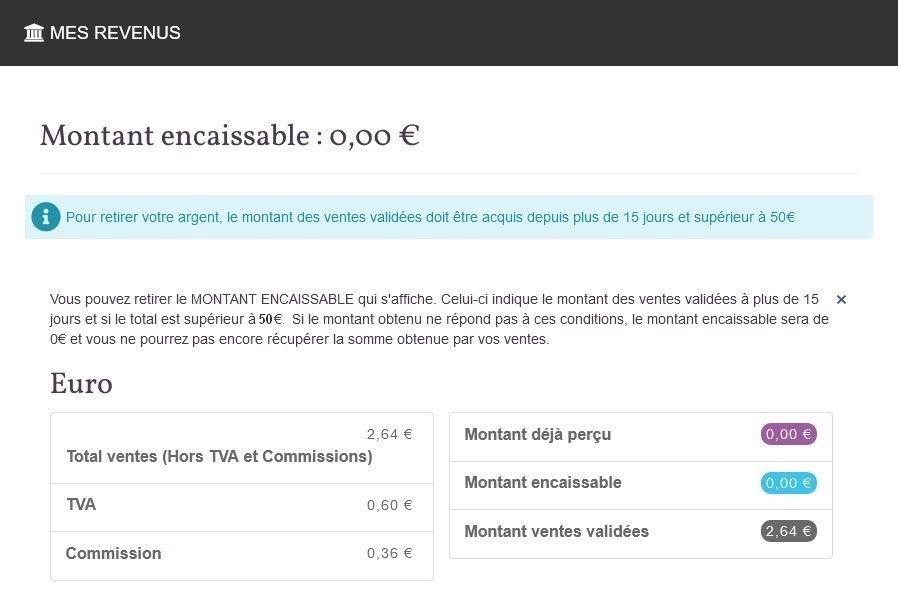 Si ces conditions ne sont pas remplies, le montant encaissable sera de 0€ et vous ne pourrez pas encore récupérer la somme obtenue par vos ventes.